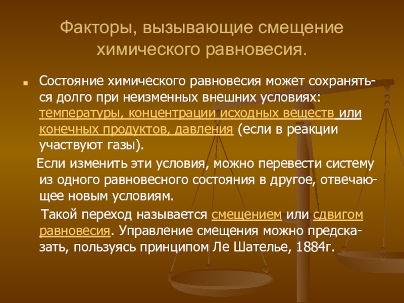 Слайд 11Факторы, вызывающие смещение химического равновесия.