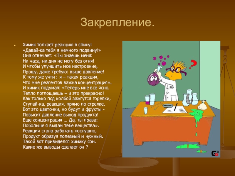 «Давай-ка тебя я немного подвину!» Она отвечает: «Ты знаешь меня: Ни часа, ни дня не могу без огня! И чтобы улучшить мое настроение, Прошу, даже требую: выше давление! К тому же учти : я – такая реакция, Что мне реагентов важна концентрация». И химик подумал: «Теперь мне все ясно. Тепло поглощаешь – и это прекрасно! Как только под колбой зажгутся горелки, Ступай-ка, реакция, прямо по стрелке. Вот это цветочки, но будут и фрукты - Повысит давление выход продукта! Еще концентрация … Да, ты права: Побольше я выдам тебе вещества». Реакция стала работать послушно, Продукт образуя полезный и нужный. Такой вот привиделся химику сон. Какие же выводы сделает он ?