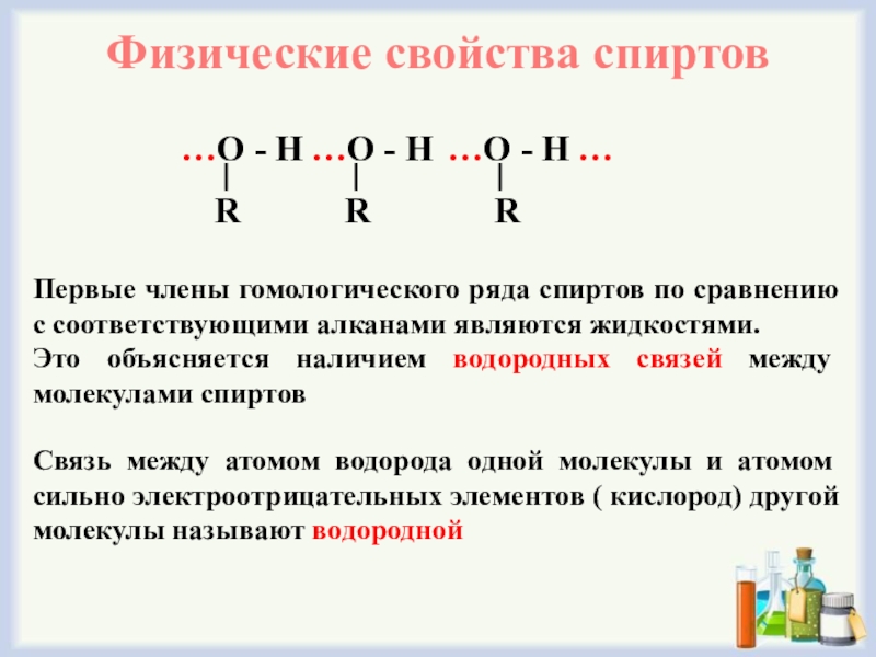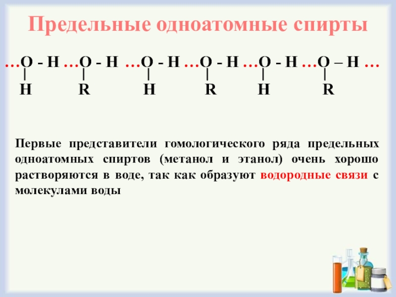 Первые представители гомологического ряда предельных одноатомных спиртов (метанол и этанол) очень хорошо растворяются в воде, так как образуют водородные связи с молекулами воды