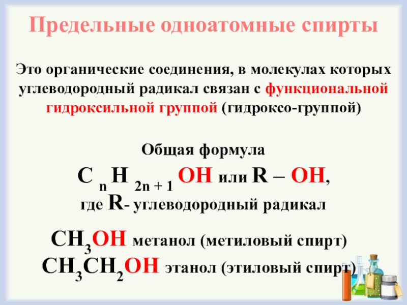 Это органические соединения, в молекулах которых углеводородный радикал связан с функциональной гидроксильной группой (гидроксо-группой)