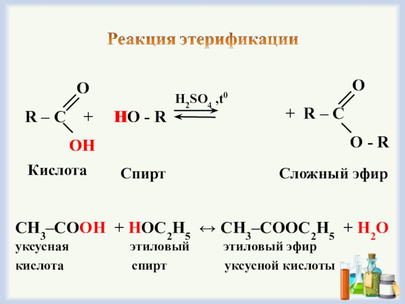 CH3–CОOH + HОC2H5 ↔ CH3–СООC2H5 + H2О