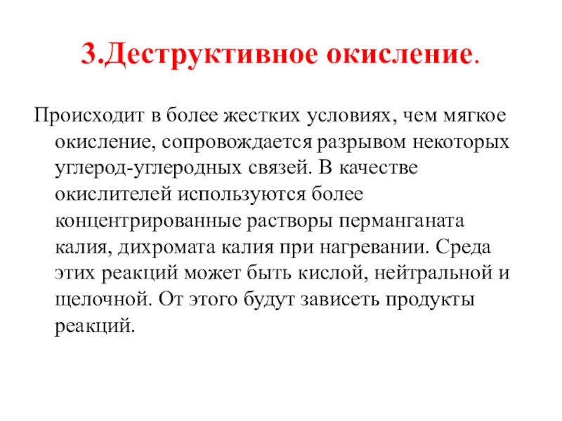 разрывом некоторых углерод-углеродных связей. В качестве окислителей используются более концентрированные растворы перманганата калия, дихромата калия при нагревании. Среда этих реакций может быть кислой, нейтральной и щелочной. От этого будут зависеть продукты реакций.