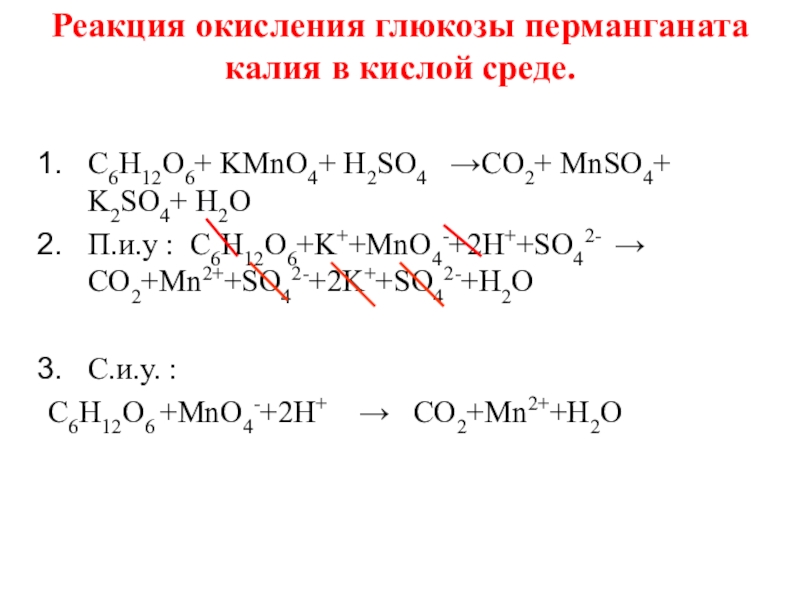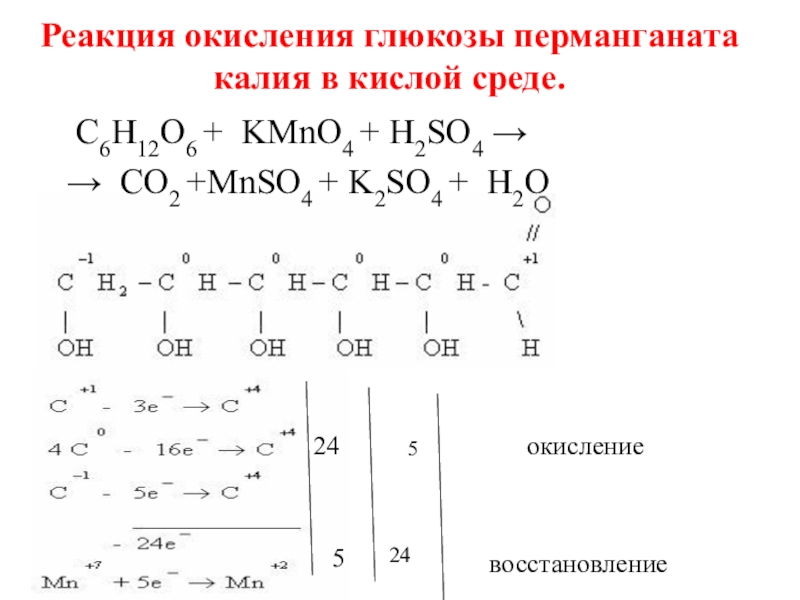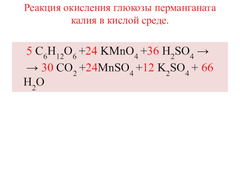 Слайд 33Реакция окисления глюкозы перманганата калия в кислой среде.