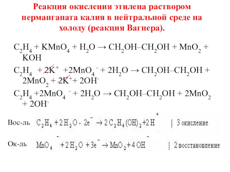 Слайд 31Реакция окисления этилена раствором перманганата калия в нейтральной среде на холоду