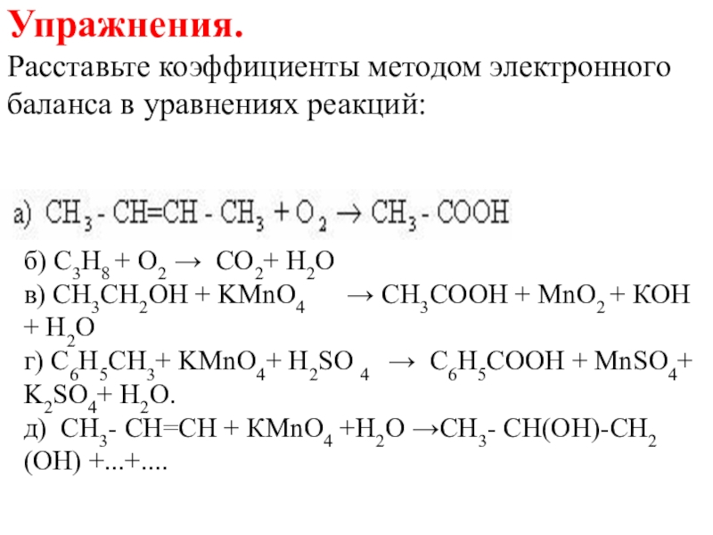 д) СН3- СН=СН + КМnО4 +Н2О →СН3- СН(ОН)-СН2 (ОН) +...+....