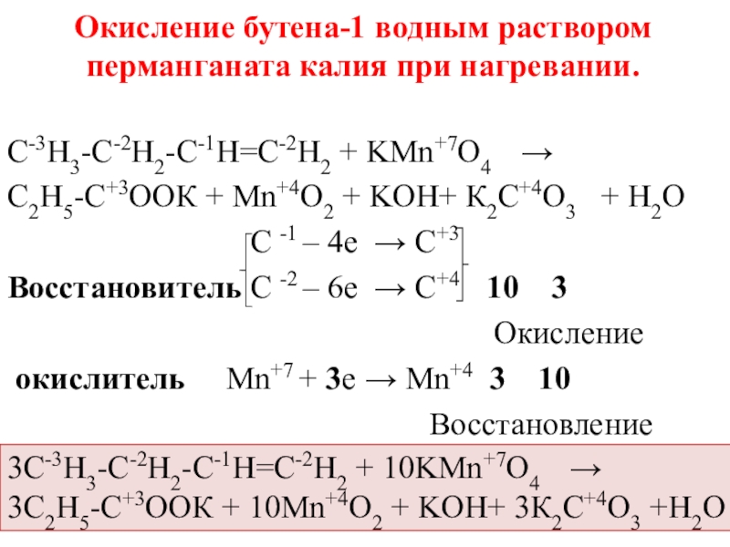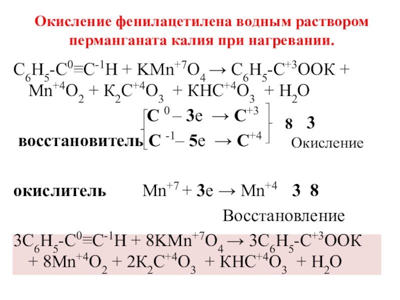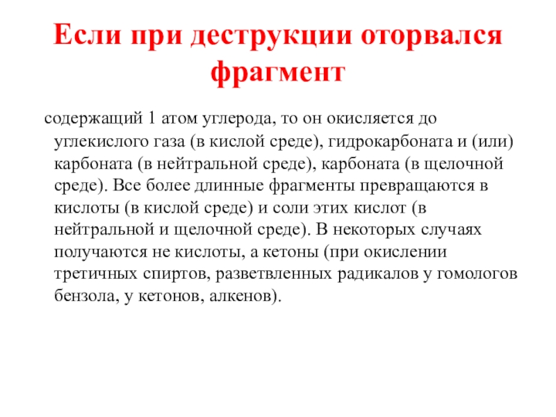 окисляется до углекислого газа (в кислой среде), гидрокарбоната и (или) карбоната (в нейтральной среде), карбоната (в щелочной среде). Все более длинные фрагменты превращаются в кислоты (в кислой среде) и соли этих кислот (в нейтральной и щелочной среде). В некоторых случаях получаются не кислоты, а кетоны (при окислении третичных спиртов, разветвленных радикалов у гомологов бензола, у кетонов, алкенов).