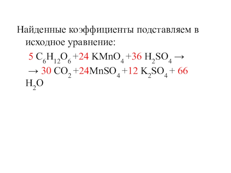 П.и.у : C6H12O6+K++MnO4-+2H++SO42- → CO2+Mn2++SO42-+2K++SO42-+H2O