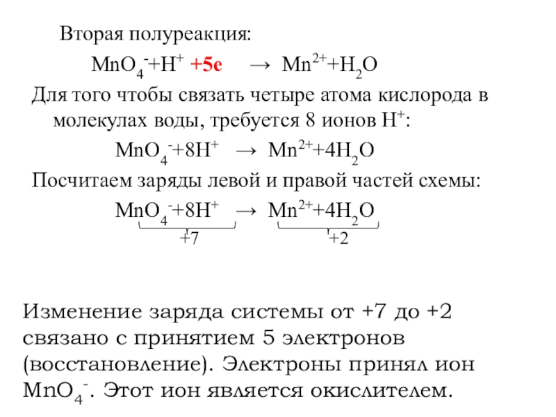 Изменение заряда системы от +7 до +2 связано с принятием 5 электронов (восстановление). Электроны принял ион MnO4-. Этот ион является окислителем.