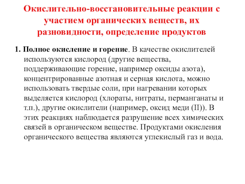окисление и горение. В качестве окислителей используются кислород (другие вещества, поддерживающие горение, например оксиды азота), концентрированные азотная и серная кислота, можно использовать твердые соли, при нагревании которых выделяется кислород (хлораты, нитраты, перманганаты и т.п.), другие окислители (например, оксид меди (II)). В этих реакциях наблюдается разрушение всех химических связей в органическом веществе. Продуктами окисления органического вещества являются углекислый газ и вода.