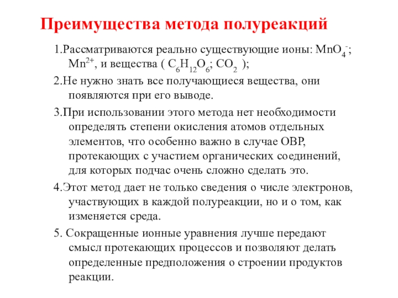 3.При использовании этого метода нет необходимости определять степени окисления атомов отдельных элементов, что особенно важно в случае ОВР, протекающих с участием органических соединений, для которых подчас очень сложно сделать это.