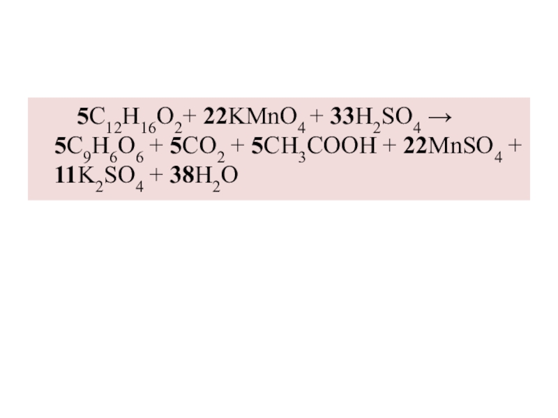 Слайд 38 5С12Н16О2+ 22KMnO4 + 33H2SO4 → 5С9Н6О6 +