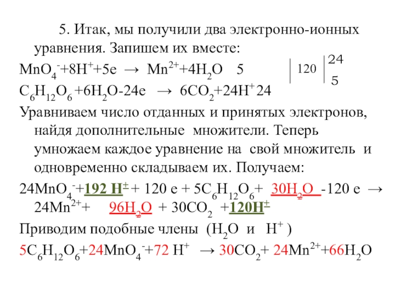 Слайд 36 5. Итак, мы получили два электронно-ионных уравнения. Запишем их вместе: