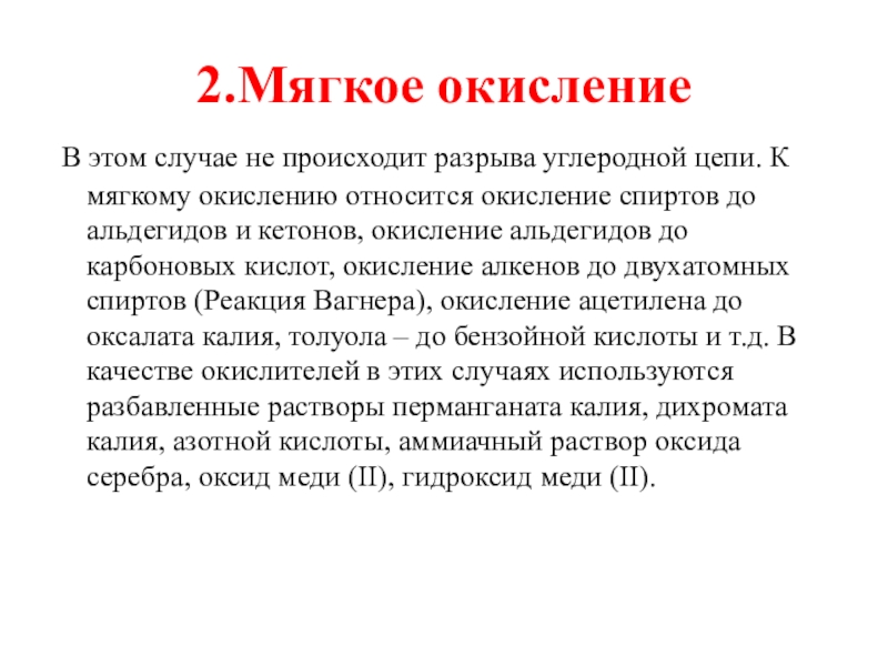 мягкому окислению относится окисление спиртов до альдегидов и кетонов, окисление альдегидов до карбоновых кислот, окисление алкенов до двухатомных спиртов (Реакция Вагнера), окисление ацетилена до оксалата калия, толуола – до бензойной кислоты и т.д. В качестве окислителей в этих случаях используются разбавленные растворы перманганата калия, дихромата калия, азотной кислоты, аммиачный раствор оксида серебра, оксид меди (II), гидроксид меди (II).