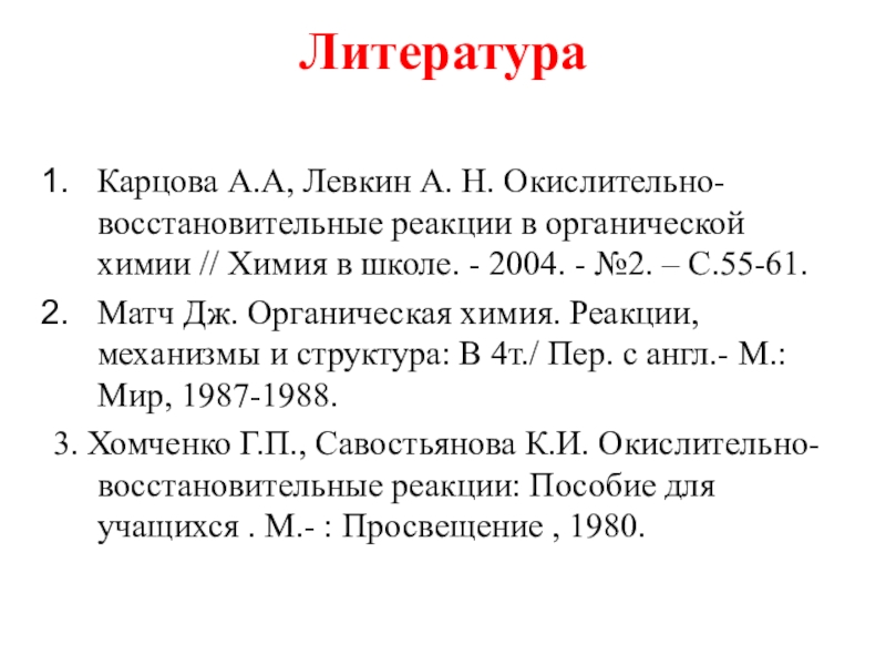 3. Хомченко Г.П., Савостьянова К.И. Окислительно-восстановительные реакции: Пособие для учащихся . М.- : Просвещение , 1980.