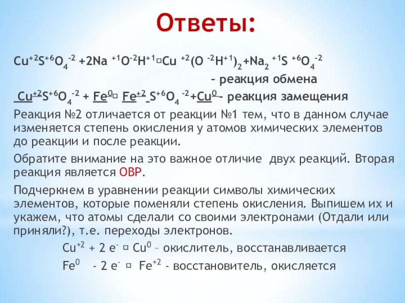 Cu+2S+6O4-2 + Fe0 Fe+2 S+6O4 -2+Сu0 – реакция замещения