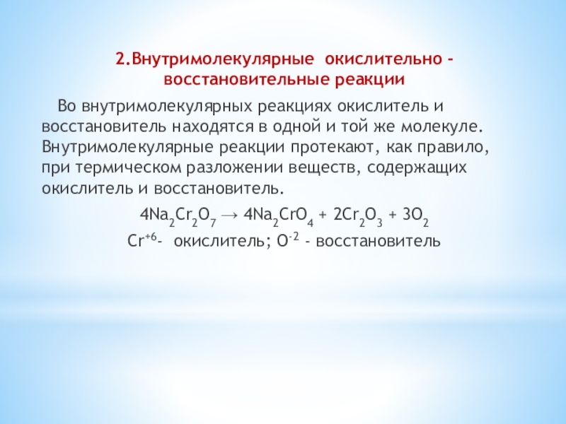 находятся в одной и той же молекуле. Внутримолекулярные реакции протекают, как правило, при термическом разложении веществ, содержащих окислитель и восстановитель.