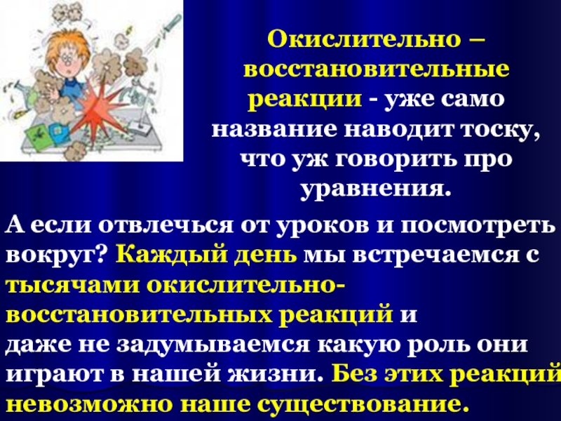 А если отвлечься от уроков и посмотреть вокруг? Каждый день мы встречаемся с тысячами окислительно- восстановительных реакций и