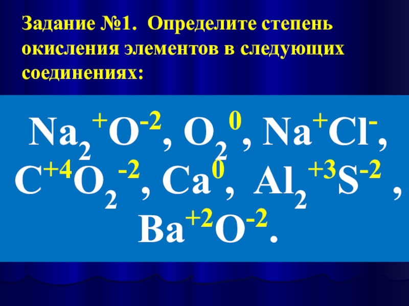 Na2+O-2, O20, Na+Cl-, C+4O2-2, Ca0, Al2+3S-2 , Ba+2O-2.