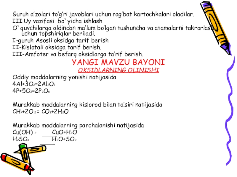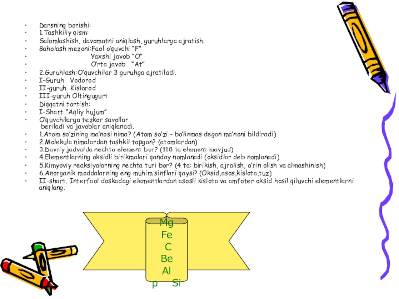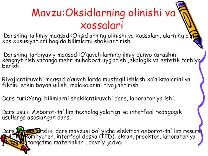 Dars usuli: Axborot-ta`lim texnologiyalariga va interfaol redagogik usullarga asoslangan dars.
