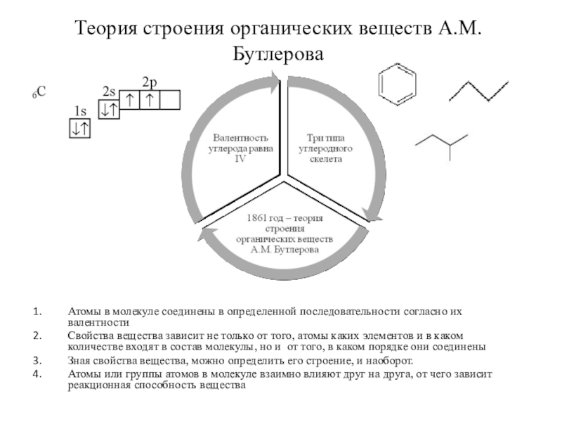 Теория строения органических веществ А.М. БутлероваАтомы в молекуле соединены в определенной последовательности согласно их валентностиСвойства вещества зависит