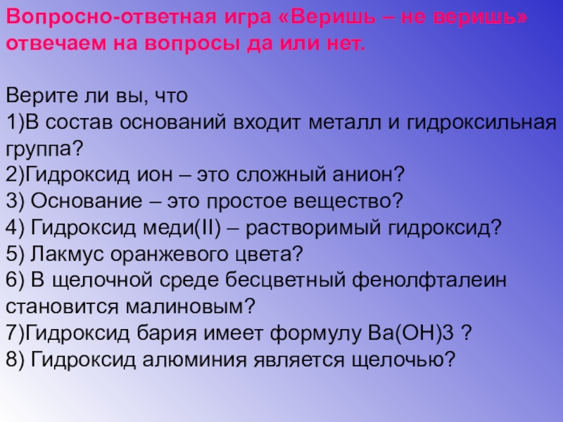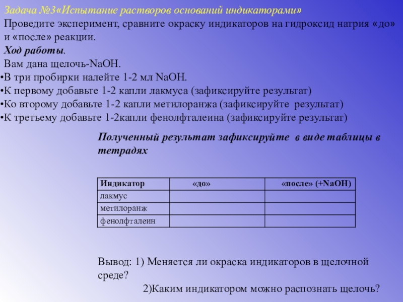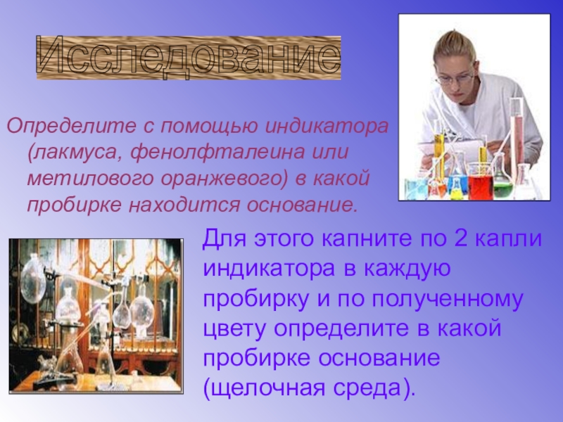 Для этого капните по 2 капли индикатора в каждую пробирку и по полученному цвету определите в какой пробирке основание (щелочная среда).