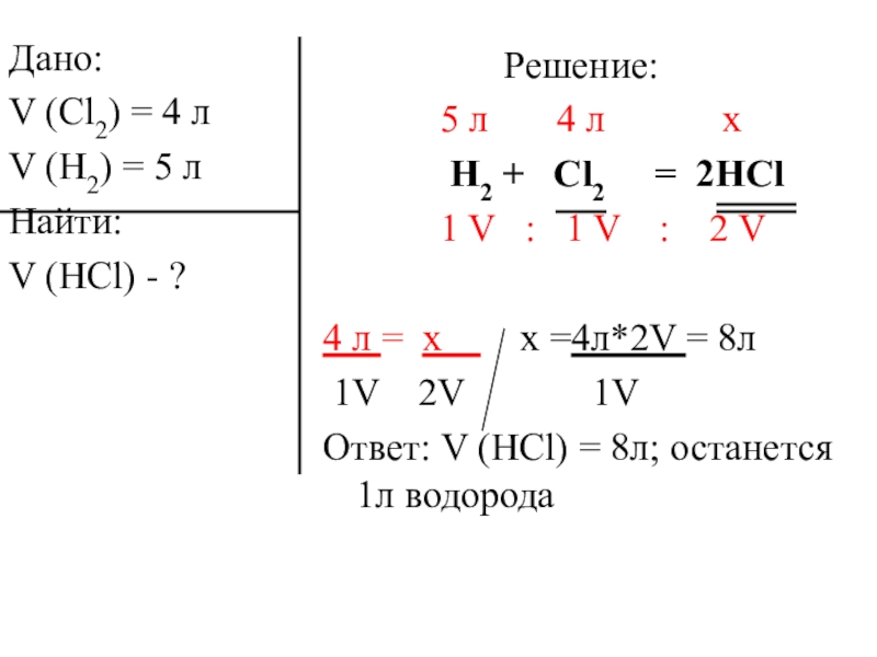 Ответ: V (HCl) = 8л; останется 1л водорода