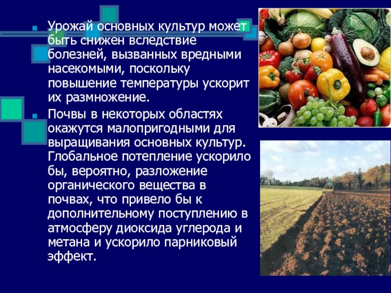 Почвы в некоторых областях окажутся малопригодными для выращивания основных культур. Глобальное потепление ускорило бы, вероятно, разложение органического вещества в почвах, что привело бы к дополнительному поступлению в атмосферу диоксида углерода и метана и ускорило парниковый эффект.