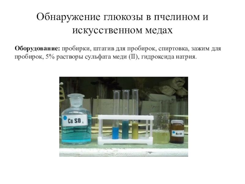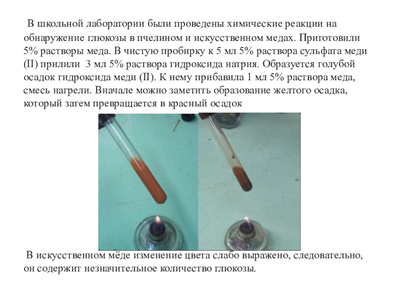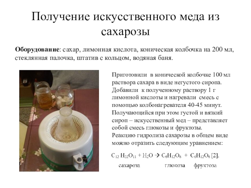 Приготовили в конической колбочке 100 мл раствора сахара в виде негустого сиропа. Добавили к полученному раствору 1 г лимонной кислоты и нагревали смесь с помощью колбонагревателя 40-45 минут. Получающийся при этом густой и вязкий сироп – искусственный мед – представляет собой смесь глюкозы и фруктозы.
