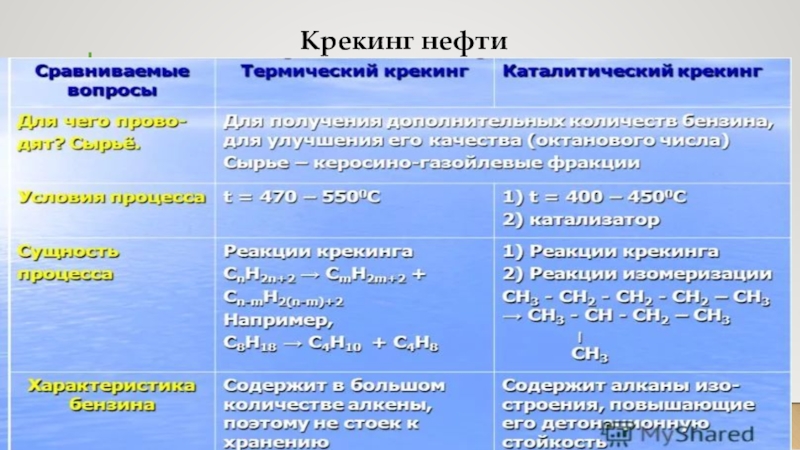 Основные методы переработки нефти на этом этапе таковы: термический крекинг (без применения катализаторов); каталитический крекинг (с использованием