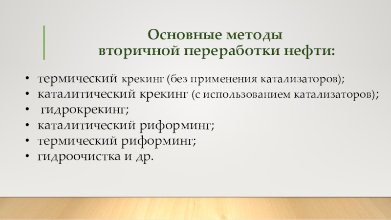 Основные методы  вторичной переработки нефти:термический крекинг (без применения катализаторов);каталитический крекинг (с использованием катализаторов); гидрокрекинг;каталитический риформинг;термический риформинг;гидроочистка