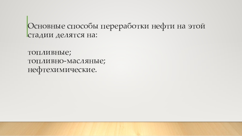 Слайд 2Основные способы переработки нефти на этой стадии делятся на: топливные; топливно-масляные; нефтехимические.
