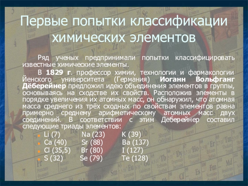 Первые попытки классификации химических элементов окончились неудачей, так как не удалось объединить все элементы в единую систему.