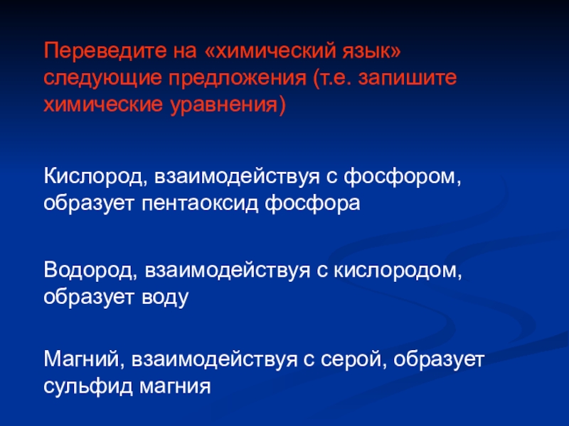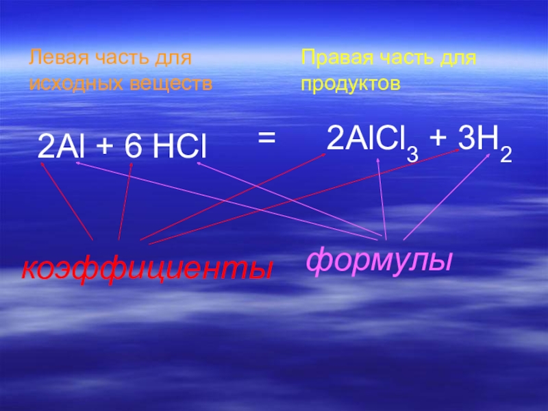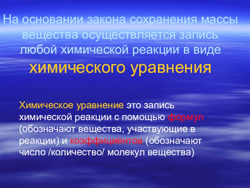 Химическое уравнение это запись химической реакции с помощью формул (обозначают вещества, участвующие в реакции) и коэффициентов (обозначают число /количество/ молекул вещества)