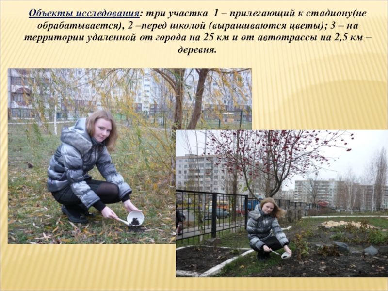 Слайд 3Объекты исследования: три участка 1 – прилегающий к стадиону(не обрабатывается), 2