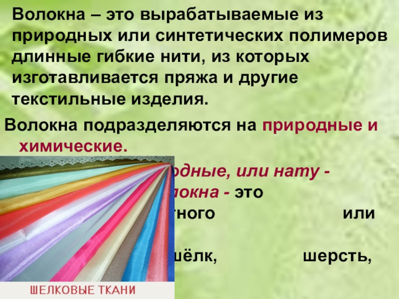 Природные, или нату - ральные, волокна - это материалы животного или растительного происхождения: шёлк, шерсть, хлопок, лён.