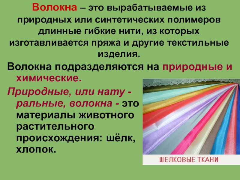 Природные, или нату - ральные, волокна - это материалы животного или растительного происхождения: шёлк, шерсть, хлопок.