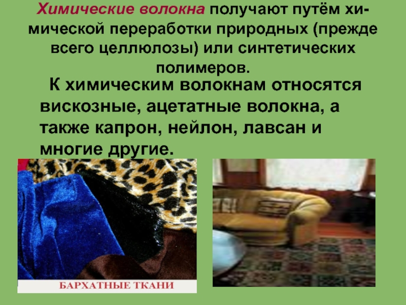 К химическим волокнам относятся вискозные, ацетатные волокна, а также капрон, нейлон, лавсан и многие другие.