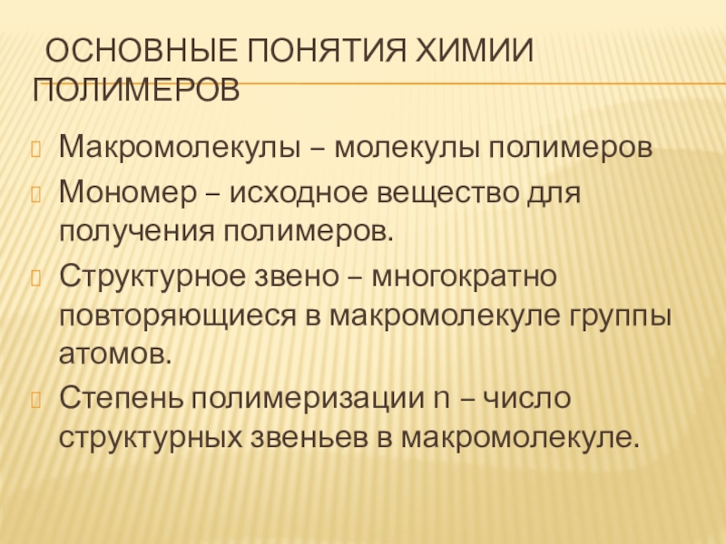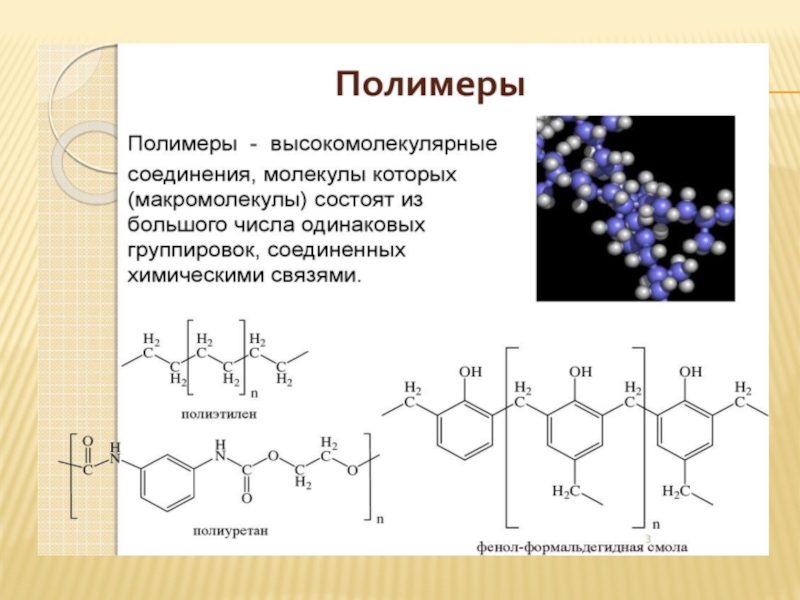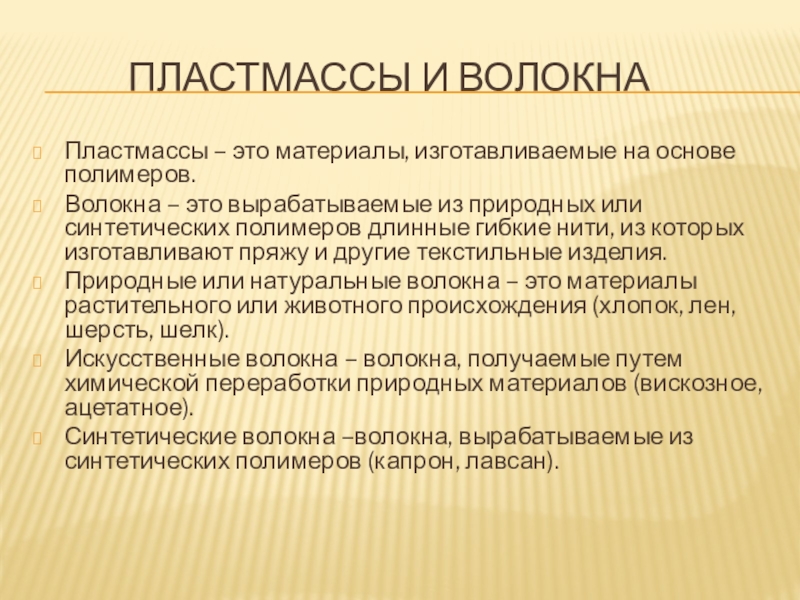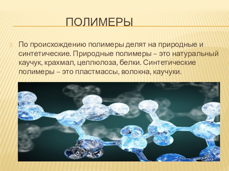 По происхождению полимеры делят на природные и синтетические. Природные полимеры – это натуральный каучук, крахмал, целлюлоза, белки. Синтетические полимеры – это пластмассы, волокна, каучуки.
