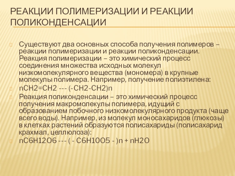 Существуют два основных способа получения полимеров – реакции полимеризации и реакции поликонденсации. Реакция полимеризации – это химический процесс соединения множества исходных молекул низкомолекулярного вещества (мономера) в крупные молекулы полимера. Например, получение полиэтилена: