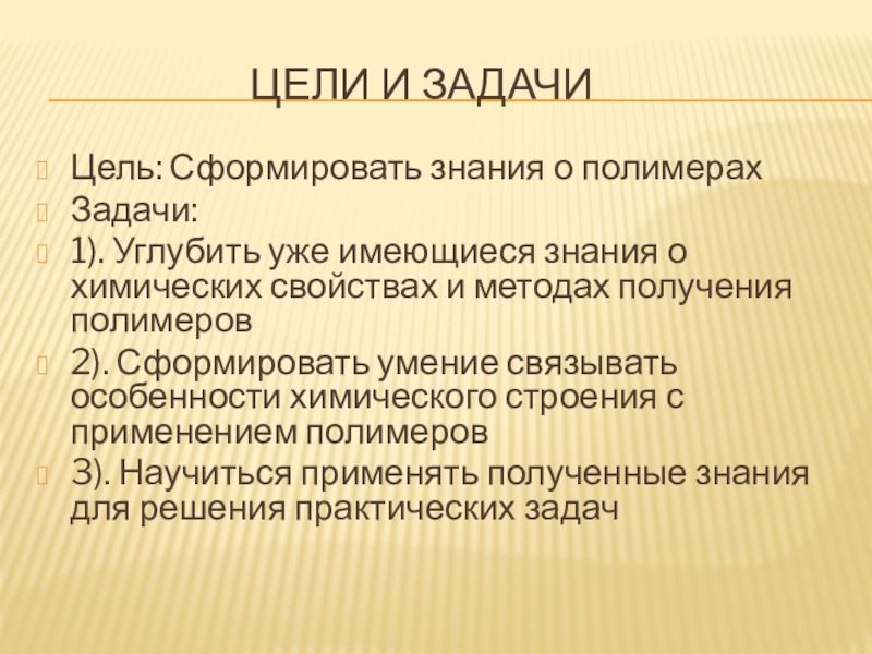 1). Углубить уже имеющиеся знания о химических свойствах и методах получения полимеров