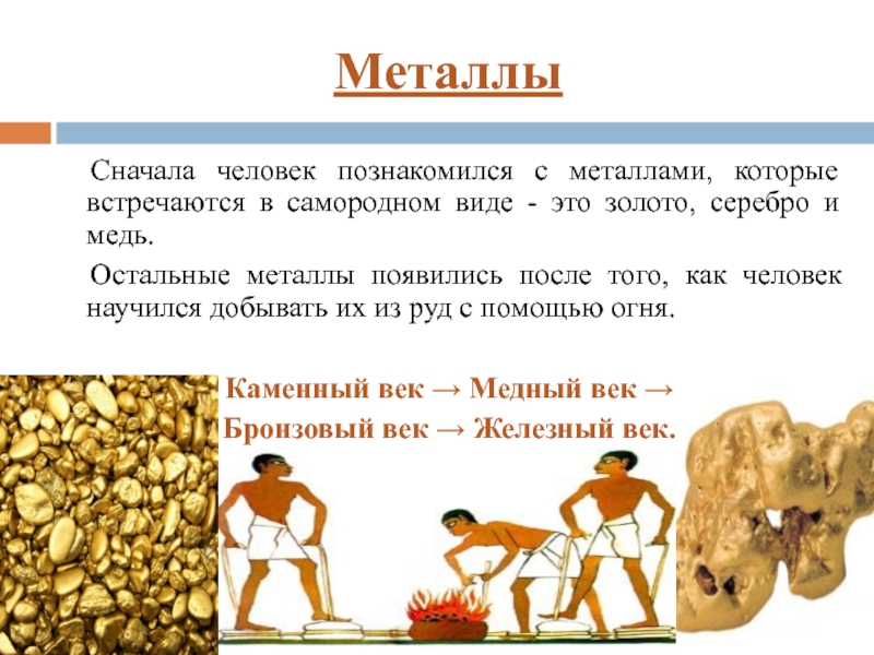 Сначала человек познакомился с металлами, которые встречаются в самородном виде -