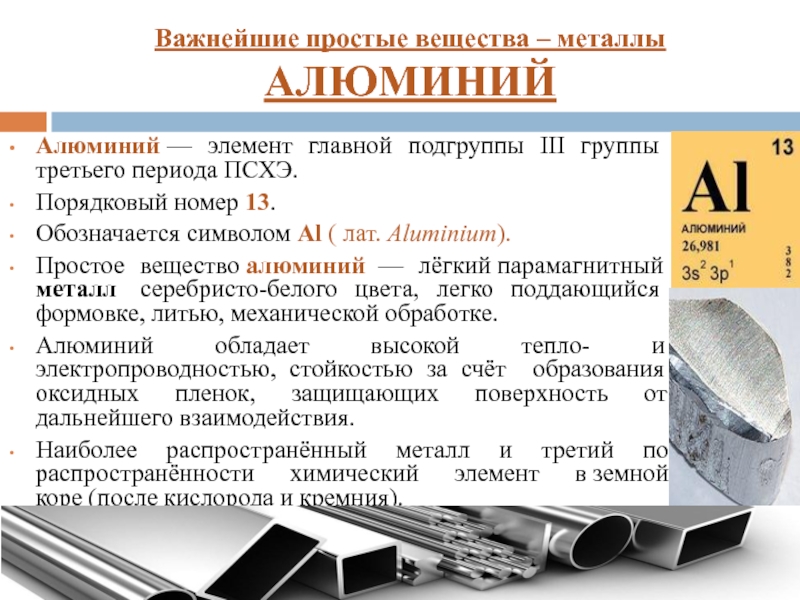 Простое вещество алюминий — лёгкий парамагнитный металл серебристо-белого цвета, легко поддающийся формовке, литью, механической обработке.