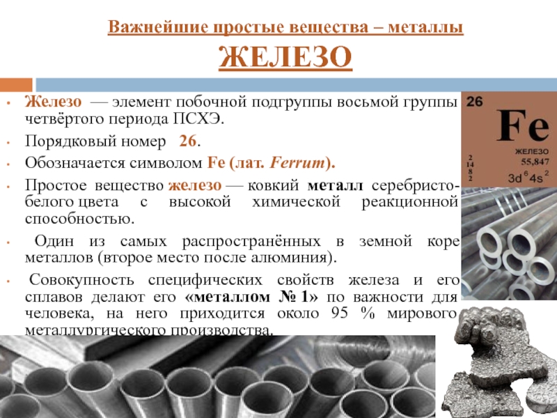 Простое вещество железо — ковкий металл серебристо-белого цвета с высокой химической реакционной способностью.