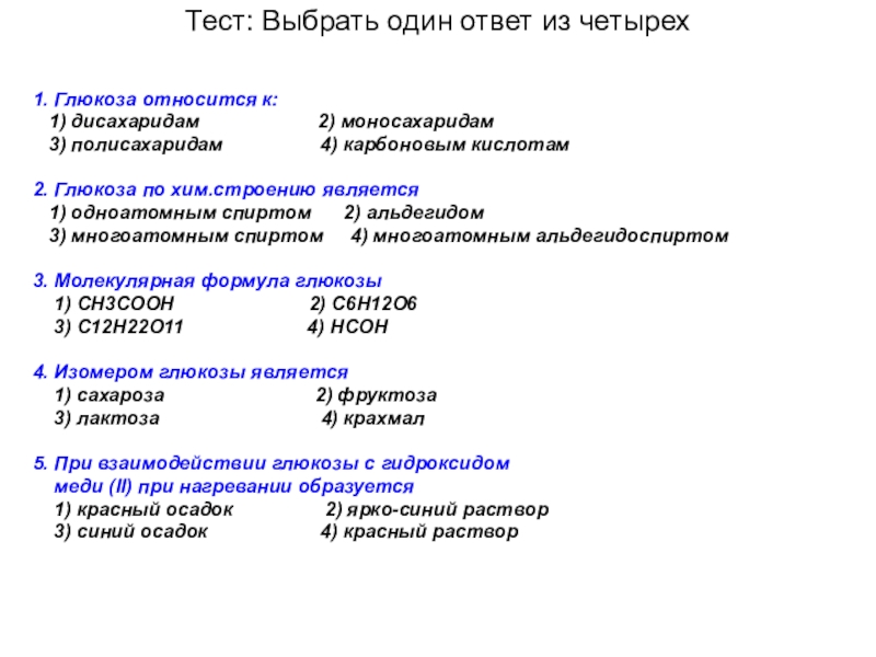 Тест: Выбрать один ответ из четырех1. Глюкоза относится к:  1) дисахаридам