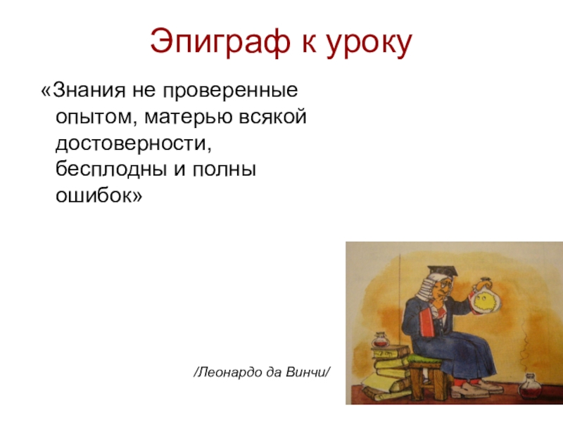 Эпиграф к уроку «Знания не проверенные опытом, матерью всякой достоверности, бесплодны и полны ошибок»