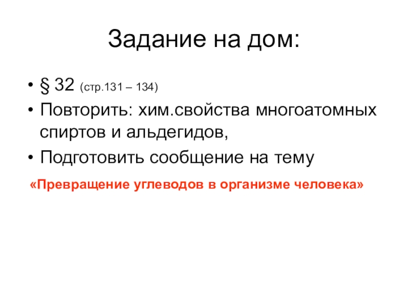 Задание на дом:§ 32 (стр.131 – 134) Повторить: хим.свойства многоатомных спиртов и альдегидов, Подготовить сообщение на тему