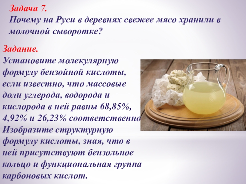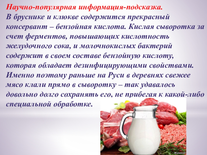 Кислая сыворотка за счет ферментов, повышающих кислотность желудочного сока, и молочнокислых бактерий содержит в своем составе бензойную кислоту, которая обладает дезинфицирующими свойствами. Именно поэтому раньше на Руси в деревнях свежее мясо клали прямо в сыворотку – так удавалось довольно долго сохранять его, не прибегая к какой-либо специальной обработке.