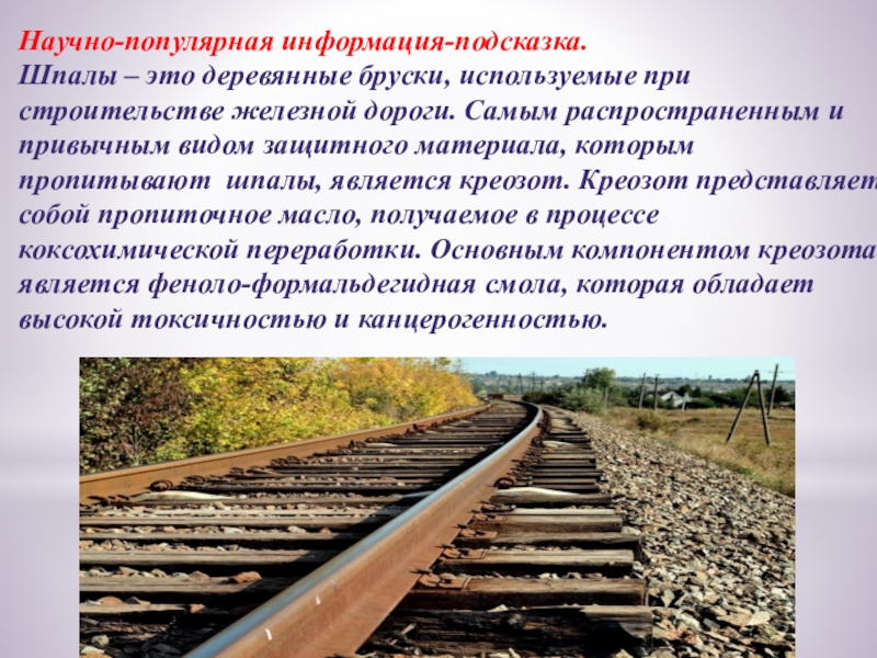 Самым распространенным и привычным видом защитного материала, которым пропитывают шпалы, является креозот. Креозот представляет собой пропиточное масло, получаемое в процессе коксохимической переработки. Основным компонентом креозота является феноло-формальдегидная смола, которая обладает высокой токсичностью и канцерогенностью.