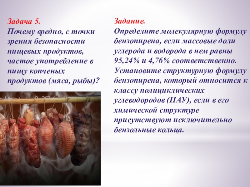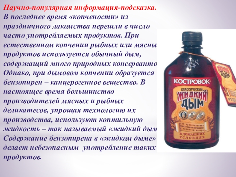 часто употребляемых продуктов. При естественном копчении рыбных или мясных продуктов используется обычный дым, содержащий много природных консервантов. Однако, при дымовом копчении образуется бензопирен – канцерогенное вещество. В настоящее время большинство производителей мясных и рыбных деликатесов, упрощая технологию их производства, используют коптильную жидкость – так называемый «жидкий дым». Содержание бензопирена в «жидком дыме» делает небезопасным употребление таких продуктов.