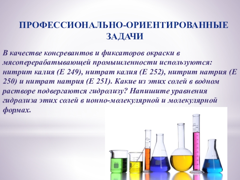 нитрит калия (Е 249), нитрат калия (Е 252), нитрит натрия (Е 250) и нитрат натрия (Е 251). Какие из этих солей в водном растворе подвергаются гидролизу? Напишите уравнения гидролиза этих солей в ионно-молекулярной и молекулярной формах.